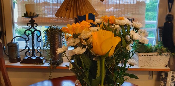 Bilden är från årets Midsommarbukett och går i blått, gult och vitt. Denna står nu på mitt köksbord och ska pryda mitt kök över helgen (om inte katten lyckas äta upp hälften)!